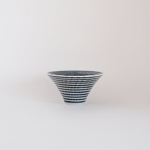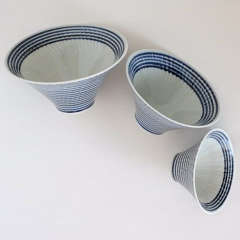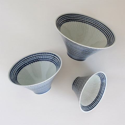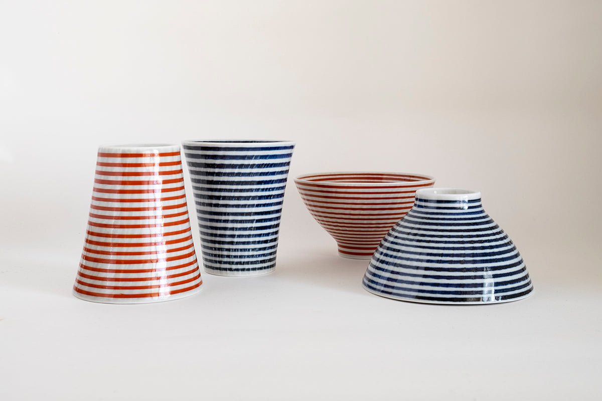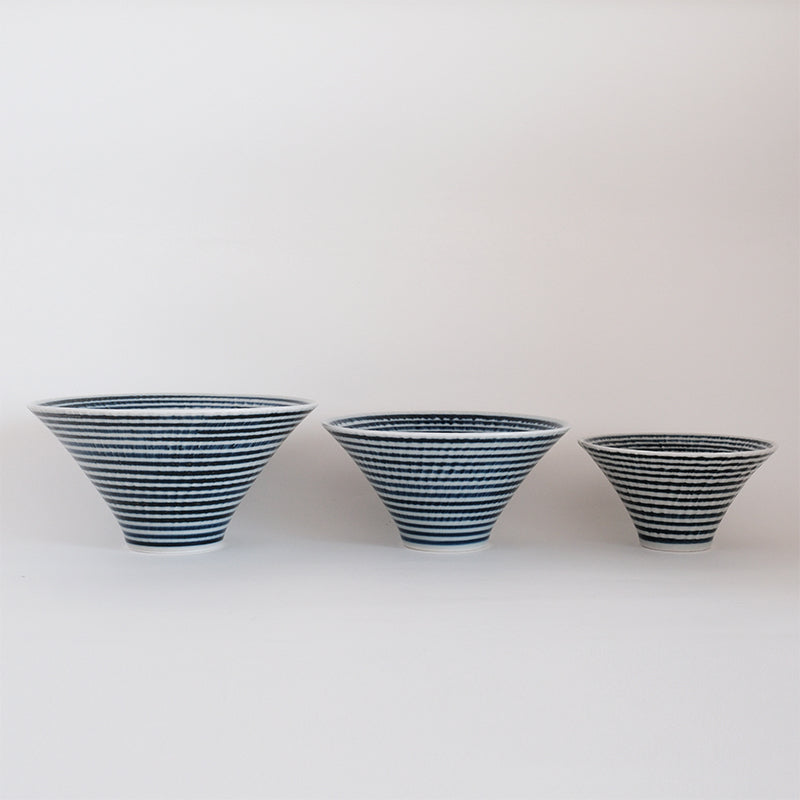 駒筋(こますじ)と呼ばれるボーダー柄の「藍駒」シリーズ。グレーがかった生地の色と藍色が落ち着いた食卓にしてくれます。