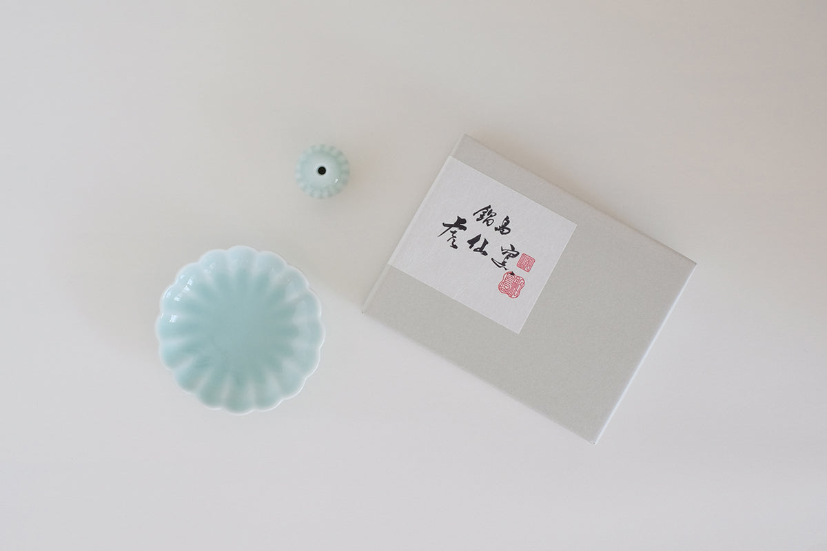 佐賀県伊万里市で鍋島焼・伊万里焼の伝統と技術を守り続ける「鍋島虎仙窯」が手掛けた香立と受け皿がセットになった商品です。釉薬は淡く青みがかった水色が特徴の青白磁という釉薬を施しています。釉薬が作り出す透明感ある濃淡の優雅な色合いをお楽しみください。