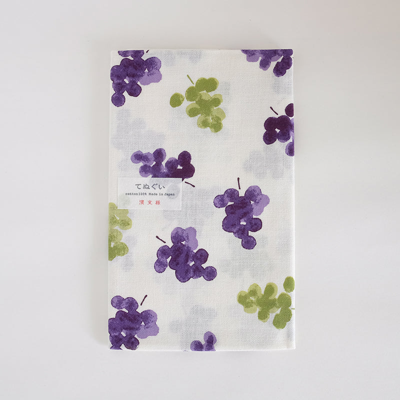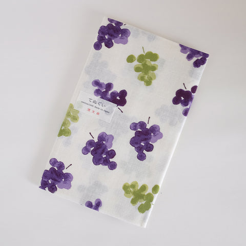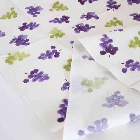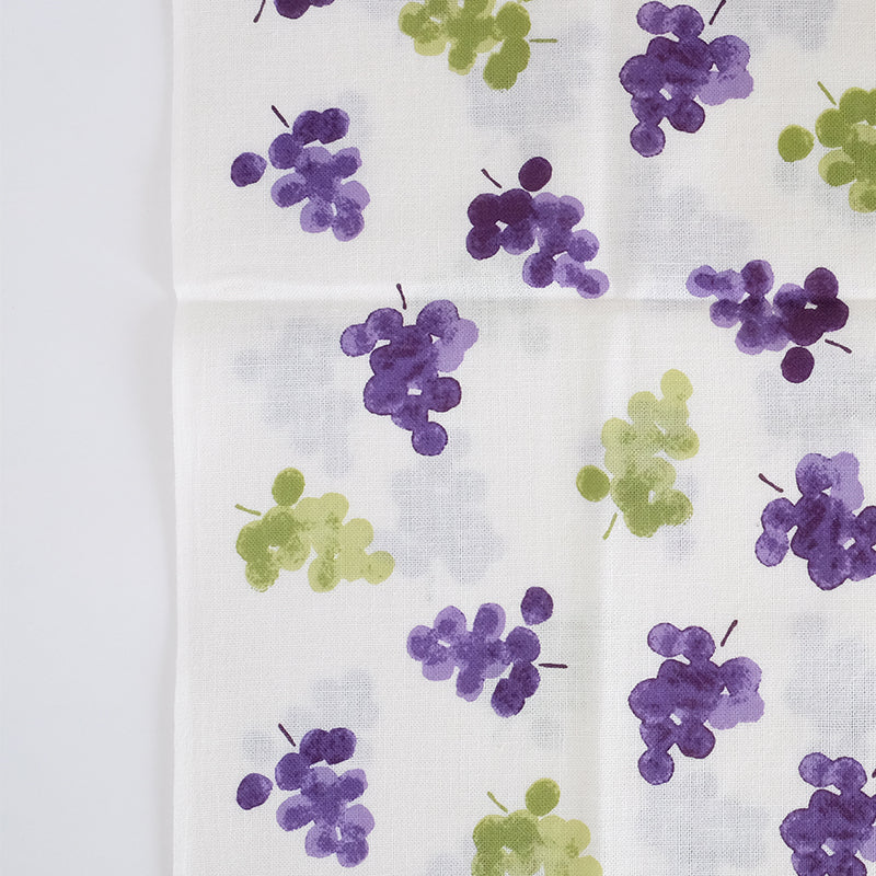 黄色味のあるオフホワイトの地に、 スタンプのインクが滲んだような質感が 印象的なぶどうの実の柄です。