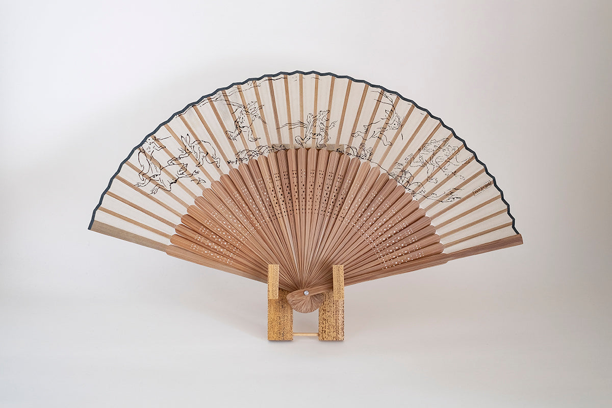 薄茶色の布に鳥獣戯画を描いたお扇子です。