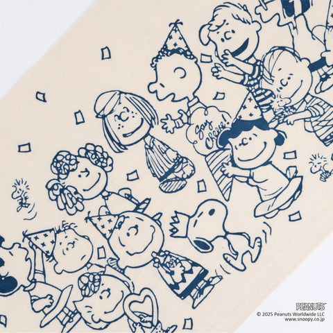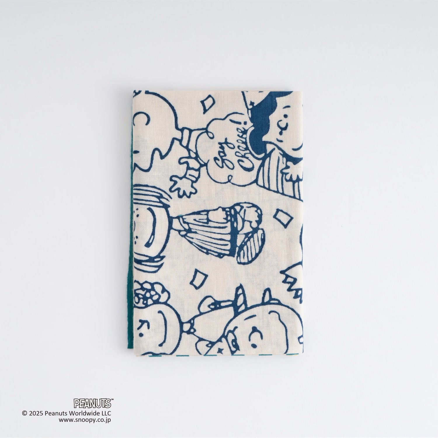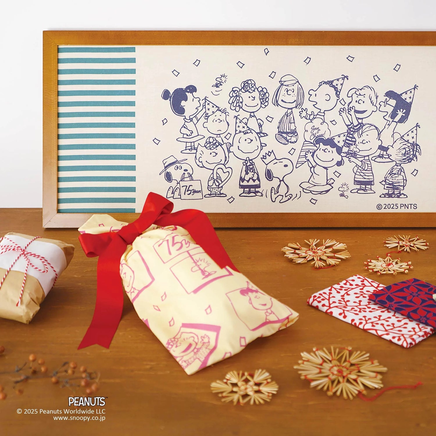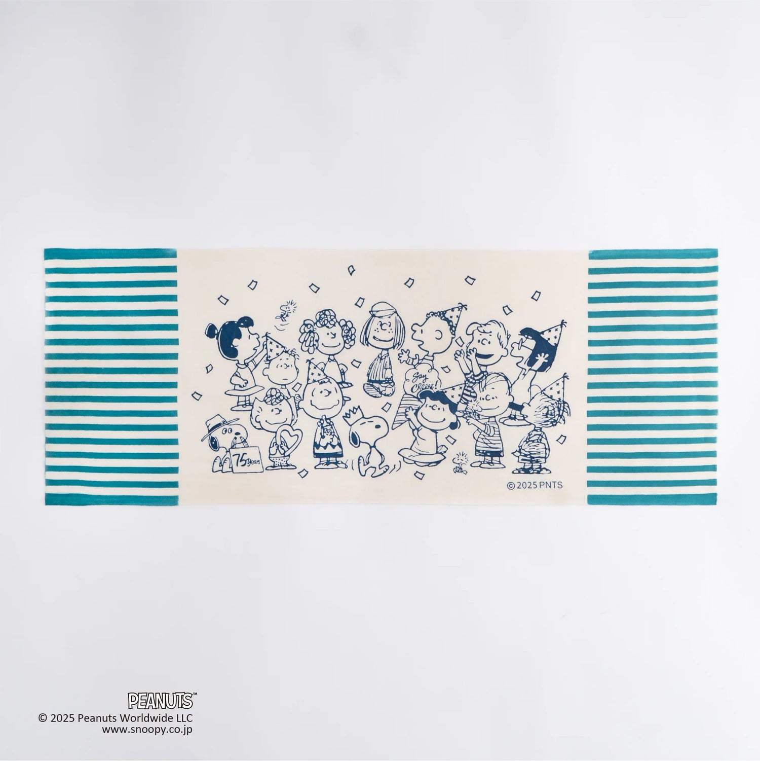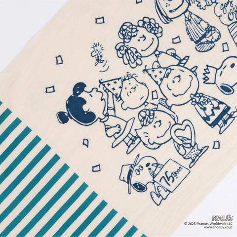 2025 年10月2日、PEANUTSはコミック誕生75周年を迎えました。様々な仲間たちが一堂に会している様子を描いたアニバーサリーデザインのてぬぐいです。