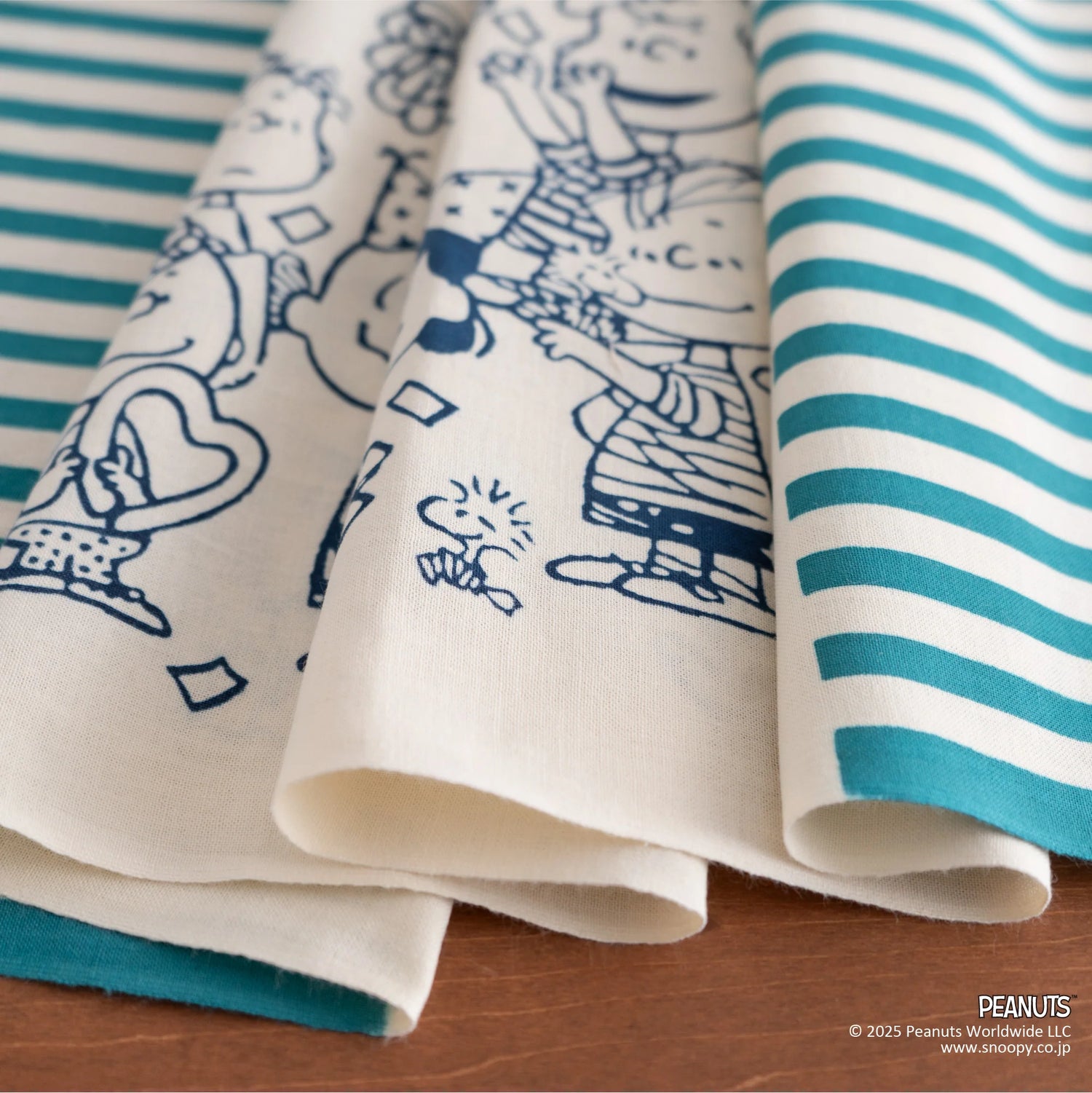 PEANUTS の仲間たちが集まっている風景にボーダー模様の組み合わせは、インテリアとしてお部屋に飾っても、また、畳んで持ち歩いても使いやすくアレンジしています。