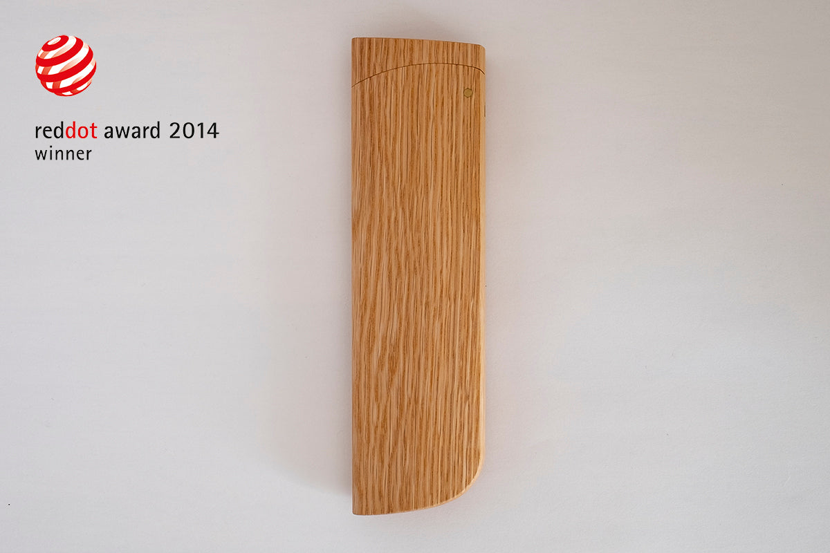 「短刀」をモチーフにした木製ペンケースです。内ポケットやカバンにすっと入る流線型のデザインが特徴。直線と曲面を用いて、木という素材の良さを活かした心地よい仕上がりを目指しました。内側にはペンが傷付かないよう革張りが施してあります。持ち運びを意識したコンパクトなサイズですので、ビジネスマンの方に特におすすめです。