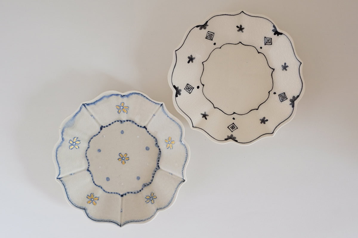 ふんわりと爽やかな呉須色と金彩の小花が可憐な印象の「染錦小花」の桔梗皿です。 器の表面には貫入と呼ばれる釉薬のヒビが入っており、自然に生み出される陶器の表情もお楽しみいただけます。 取り皿として使いやすいサイズ感で、副菜やおかずはもちろん、ケーキやデザートなどの盛り付けにもぴったりです。